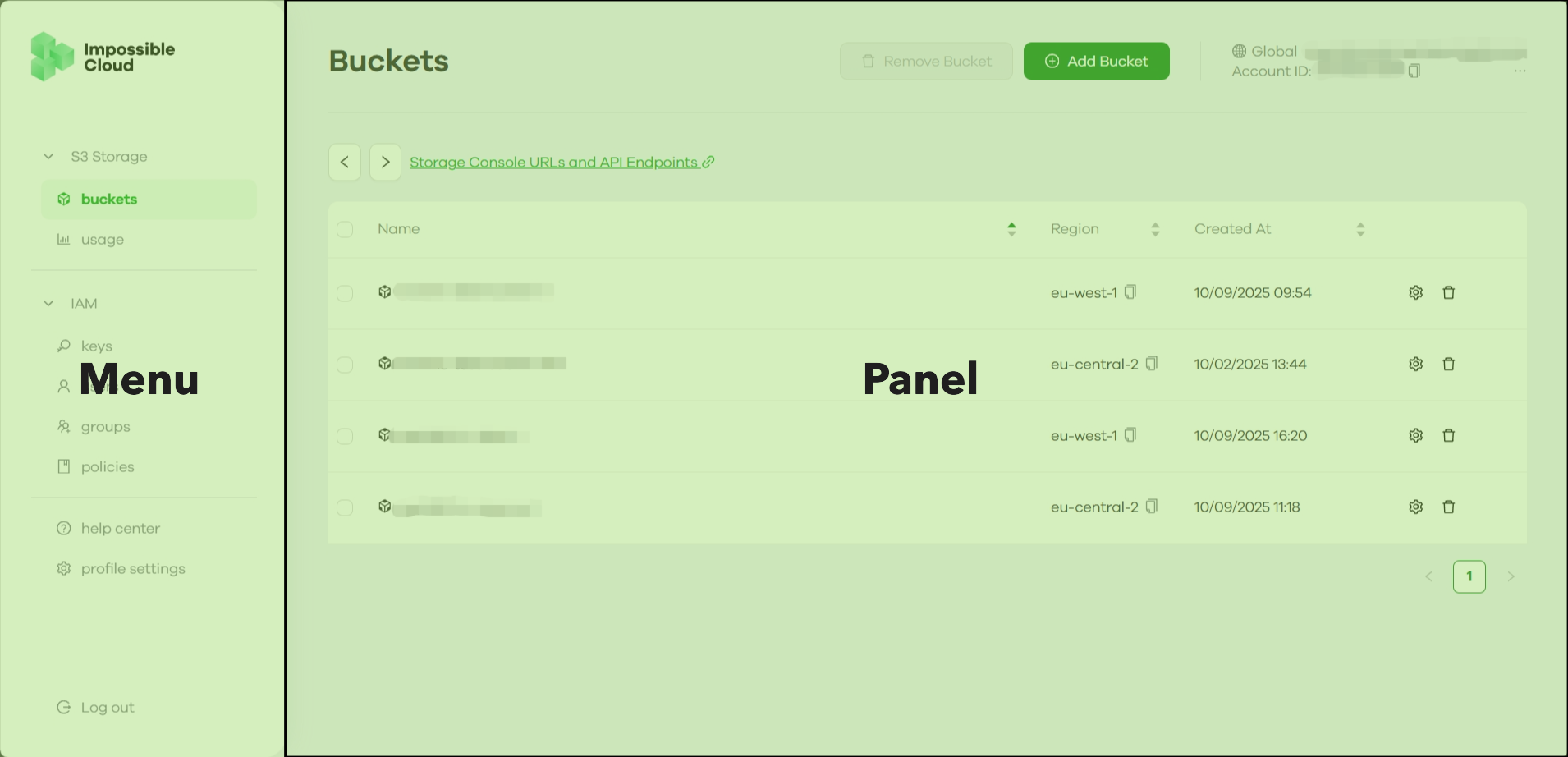 After signing in to the Impossible Cloud Console, you can see both the menu on the left-hand side as well as the panel on the right-hand side. See the following pages for details on how to both navigate the menu as well as use the panel.